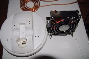 The ice water is pumped out of the reservoir through a spiral coil of small diameter copper tube. The diameter of the spiral should match the diameter of the fan. The center area will not have any air moving across it so be sure to check the fan as you are bending the tubing. I
