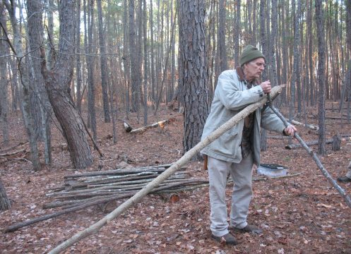 Another thing to look for is a tree with a strong, low lying limb, or a tree with a fork that is three or four feet off of the ground. This tree will support the ridgepole of your shelter. If you find a good location, but it doesn’t have a tree to support your ridgepole; you can use two forked sticks and lock them together to support the ridgepole.